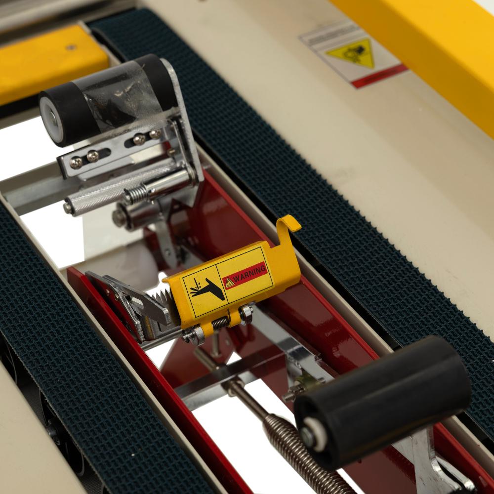 - Двухпоясная система протяжки. Верхние и нижние конвейерные ремни работают синхронно, обеспечивая стабильное движение даже тяжелых коробов (нагрузка до 20 кг). Исключается застревание и смещение ленты в процессе заклейки.